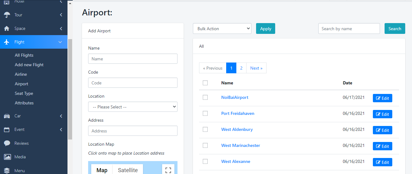 Na lista de aeroportos, navegue atéPainel > Voos > Aeroportopara adicionar novo aeroporto