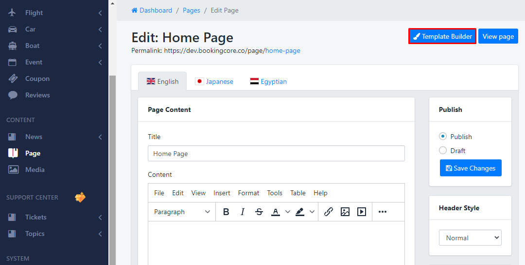 Etapa 1: Navegue até o modelo para criar o conteúdo da página inicial com os elementos principais do Booking
